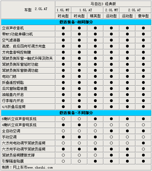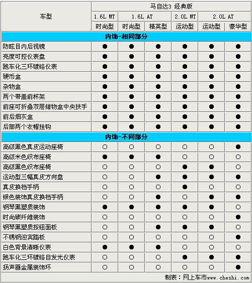長安馬自達旗下的新款三廂轎車——馬自達3經(jīng)典版于6月21日正式上市,售價為11.28萬-14.98萬。這款分別搭載1.6L引擎和2.0L引擎的新車,由于配置和動力差異共分為6款車型。其中1.6手動時尚型和1.6自動時尚型的差價為1萬元,而低配車型和2.0自動豪華版車型的差價高達 3.7萬元,那么它們之間到底有著怎樣的配置差異呢?