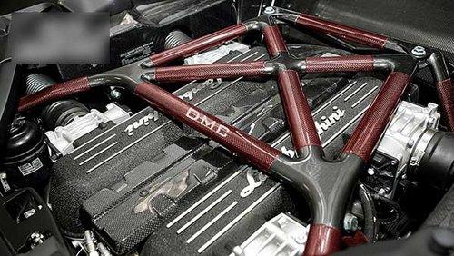 打開背部的引擎蓋,可以發(fā)現(xiàn)一個(gè)印有DMC字樣的紅色碳纖加強(qiáng)架,在加強(qiáng)架下的V12引擎經(jīng)過重新DMC的ECU刷寫后,馬力提升至670匹的水平。經(jīng)過測速,這臺Quattro Veloce在0-96的加速時(shí)間只需3.2秒,可見Murcielago強(qiáng)大的改裝潛力。