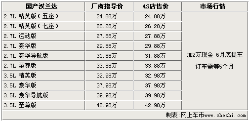 2009年5月25日,廣州豐田正式推出了SUV車型漢蘭達(dá),售價(jià)24.88—42.98萬元。作為一款日系經(jīng)典SUV車型,這款車以進(jìn)口方式銷售時(shí)就得到了廣大消費(fèi)者的喜愛,此次國產(chǎn)后的漢蘭達(dá)增加了2.7升排量的車型,不僅使車系的價(jià)格較進(jìn)口車型降低不少,而且還增加了消費(fèi)者的選擇空間。目前國產(chǎn)漢蘭達(dá)的現(xiàn)車還沒有到店,急于提車的消費(fèi)者需要加價(jià)提車。