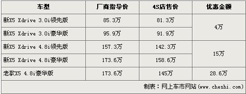 寶馬全新X5于去年7月上市,此車的上市為競爭激烈的高性能運動型多功能車(SAV)細分市場再次在操縱靈活性方面制定起新的標準。全新寶馬共有3.0L及4.8L兩個排量選擇,價格區(qū)間為83.7萬元-173.6萬元。近日根據(jù)網(wǎng)上車市價格檢測系統(tǒng)顯示:寶馬X5全系最高優(yōu)惠金額達28.6萬元,具體詳情請看下表: