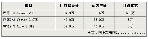 據(jù)4S店銷售人員介紹:目前薩博9-3現(xiàn)車較充足,最高優(yōu)惠可達6萬元,標準型薩博9-3目前優(yōu)惠4.5萬。如需訂購顏色較少的車,等待時間在1-2周左右。