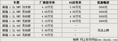 據吉利汽車4S店銷售人員介紹,熊貓1.3L手動擋車型目前都有現(xiàn)車銷售,而自動擋雖然已經上市,但由于北京地區(qū)無法上牌,所以還沒有現(xiàn)車抵達北京市場,預計最早會在今年8月份解決無法上牌的問題。目前熊貓1.3L手動擋全系可以優(yōu)惠五千元,而這款車型還增加了電動升級后窗,需要在原價的基礎上加1000元。