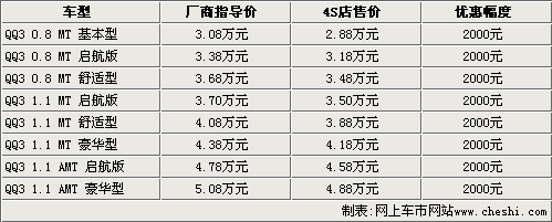 今年年初,奇瑞汽車正式推出了QQ3啟航版,共有三款車型,售價(jià)3.38-4.78萬(wàn)元。奇瑞QQ3啟航版是在原有車型的基礎(chǔ)上增加更多使用配置,而價(jià)格方面也與原車型基本保持一致。奇瑞推出的QQ3啟航版使該系列車型在性價(jià)比方面進(jìn)一步提高。據(jù)網(wǎng)上車市網(wǎng)站價(jià)格監(jiān)測(cè)系統(tǒng)顯示,奇瑞QQ3目前出現(xiàn)了一定的優(yōu)惠幅度。