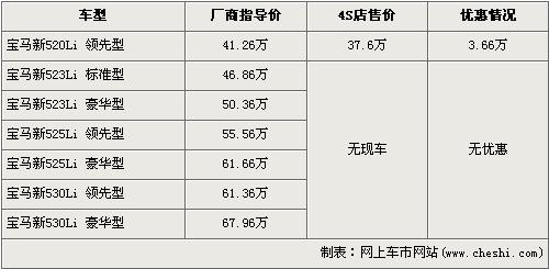 據(jù)北京寶馬經(jīng)銷店的銷售人員介紹,目前購買寶馬新520Li領(lǐng)先型可以得到3.66萬元的優(yōu)惠,經(jīng)優(yōu)惠后新520Li領(lǐng)先型的售價從41.26萬元降到了37.6萬元。銷售人員還介紹,目前店內(nèi)除了520Li領(lǐng)先型有現(xiàn)車外,其它車型均無現(xiàn)車,欲購買的消費者需交定金2萬元,約等1個月后可提車。