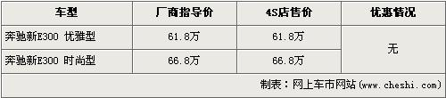 據(jù)北京奔馳4s店銷售人員介紹,奔馳新E級先期上市的車型為E300優(yōu)雅型和E300時尚型,售價分別為61.8萬元和66.8萬元。前期預(yù)訂新E級的車主已經(jīng)可以到店內(nèi)提車,近期欲購買奔馳新E級的消費者需交1萬元訂金,9月份才可提車。