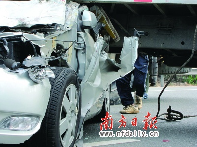 比亞迪轎車上的林先生告訴記者,他們是廣東湛江人,昨天他帶著女朋友和親戚乘坐侄子的小車回老家準(zhǔn)備結(jié)婚。沒想到侄子脾氣不太好,看到貨車司機(jī)在前邊的快車道上不急不慢地行駛,一時(shí)急于超車,結(jié)果不小心發(fā)生了撞車,侄子的眉骨被撞裂,傷勢稍微嚴(yán)重一些,其他人則是不同程度的輕傷。