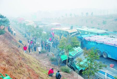 前天上午9時許,滬陜高速商城至固始段突起大霧,該路段商城服務(wù)區(qū)東800米處10余輛汽車發(fā)生連環(huán)相撞,造成1人死亡。