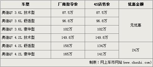 Q7是奧迪打造的第一款“高性能SUV”,同時(shí)也是奧迪引進(jìn)中國(guó)的第一款頂級(jí)SUV車型。Q7憑借杰出的運(yùn)動(dòng)性、高超的操控性及沖擊性極強(qiáng)的外形在上市時(shí)就獲得了人們的關(guān)注。隨著在上海車展亮相的改款新Q7即將上市,在售的老款Q7已經(jīng)停產(chǎn)。目前在售的奧迪Q7出現(xiàn)了最高為24萬元的優(yōu)惠,具體詳情請(qǐng)看下表: