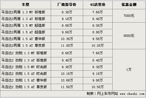 馬自達(dá)2是長(zhǎng)安馬自達(dá)繼3系列之后又一定位更加年輕化的城市小車(chē),Mazda2沿襲馬自達(dá)經(jīng)典的“Zoom-Zoom”設(shè)計(jì)理念,并同時(shí)結(jié)合了優(yōu)異的安全性、舒適性及燃油經(jīng)濟(jì)性表現(xiàn)。根據(jù)網(wǎng)上車(chē)市價(jià)格監(jiān)測(cè)系統(tǒng)顯示,目前全系最高可優(yōu)惠現(xiàn)金1萬(wàn)元左右,具體行情如下: