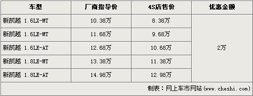 據(jù)4S店銷售人員介紹,新凱越分為1.6L與1.8L兩種排量車型,目前新凱越全系優(yōu)惠2萬元,較上個月的優(yōu)惠降幅有所下降。經(jīng)優(yōu)惠后,全系最低配的1.6LX-MT車型售價下降到了8.38萬元。經(jīng)優(yōu)惠后,1.8L手動和自動兩款車型售價也下降到了11.38萬元和12.98萬元。銷售人員還介紹,目前店內(nèi)現(xiàn)車齊全,是消費者挑選的較好時機(jī)。