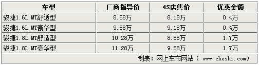 據(jù)北京地區(qū)華晨中華汽車4S店銷售人員介紹,駿捷1.8L目前現(xiàn)車都比較齊全,而且優(yōu)惠幅度較大,維持在1.7萬元左右。同時(shí)購買駿捷1.6L車型也可優(yōu)惠現(xiàn)金4000元,相當(dāng)?shù)某怠A硗,如果到店詳談,還可以贈(zèng)送部分裝飾。
