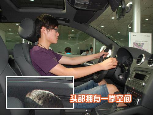 A3算是奧迪家族里面身材最為迷你的一位成員了,三圍參數(shù):4292mm*1765mm*1423mm,軸距為2578mm,絕對的緊湊級身材。視覺從車外直觀看過去,相對低矮的車身有點擔(dān)心空間的問題,測試者178CM。