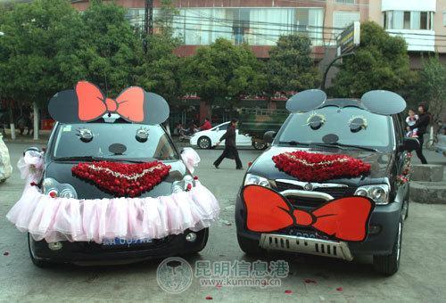 大紅色的蝴蝶結(jié)、黑色靈巧的眼睛、玫瑰花鋪成的鼻子,一輛小型越野車經(jīng)過巧妙的裝扮,變成了可愛的“米老鼠”。一旁,站著“Mickey”的愛人“ MINI[綜述 圖片 論壇]”。粉色的公主紗、車頂戴上蝴蝶結(jié)、滿天星花朵做成長長的睫毛、配上黑黑的大眼睛,比亞迪小車搖身一變成了“MINI”、“Mini”嬌羞地站在“Mickey”旁邊,引得路人駐足觀看!疤蓯哿,車子這樣一打扮,都認不出原貌了,比奔馳還拉風,真有創(chuàng)意!”一名男士拿出手機,為兩只可愛的“米老鼠”拍照。兩輛造型可愛的婚車,引來不少路人拍照留念。
