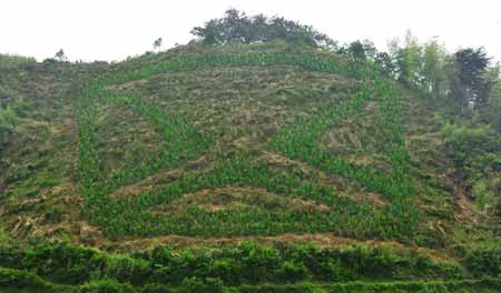 從圖上可以看出,一面數(shù)千平米的山坡上,數(shù)千棵樹木排列成奇怪而規(guī)則的圖案——一個規(guī)則的方框內(nèi)三個獨立的小三角,將空間劃分開來,看線條,極似“X”,與旁邊野生的樹木形成鮮明對比。初步判斷,“神秘林”絕非天然形成。據(jù)當(dāng)?shù)厝罕姺从,神秘樹陣的所在地確實是在武功山,處于安?h北側(cè)的北華山附近。樹林是幾天前出現(xiàn)的,但為什么是這個圖案,當(dāng)?shù)厝税偎疾坏闷浣。“原來并沒有相似的事情發(fā)生”一位李姓村民說道,“最近大家都開始議論這是不是所謂的麥田怪圈!”