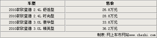 歐藍(lán)德是三菱汽車第一款采用轎車底盤形式生產(chǎn)的SUV,沿用了三菱Lancer(藍(lán)瑟)轎車的平臺(tái),具有轎車乘坐的舒適性,同時(shí)它又有SUV的特性。全新一代的歐藍(lán)德EX采用了藍(lán)瑟EVO車型典型的隔柵及雙氙氣前車燈的造型,使得其看起來更加兇猛。2009年10月13日三菱汽車正式在中國地區(qū)推出了全新一代歐藍(lán)德EX車型,售價(jià)26.8-36.2萬元不等。近日我們從三菱汽車內(nèi)部人士處了解到,為了更好的滿足中國消費(fèi)者,三菱汽車將在廣州車展上推出2.0排量的歐藍(lán)德車型,預(yù)計(jì)售價(jià)將在22萬元左右。與此同時(shí),我們從北京地區(qū)三菱4S店了解到,目前2.4排量的已有現(xiàn)車銷售,但車型不全,全系車型暫時(shí)沒有任何型形式的優(yōu)惠。具體車型售價(jià)見下表: