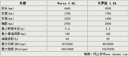 豐田Verso與卡羅拉雖然采用了同一技術(shù)平臺,但是由于這兩款車的類型不同,因此在車身尺寸方面也存在著較大的差異。豐田Verso雖然在車長方面遜于卡羅拉,但是在車寬、車高及軸距方面,這款MPV車型還是占據(jù)著明顯的優(yōu)勢。另外,這兩款車雖然均采用1.6L發(fā)動(dòng)機(jī),但是由于調(diào)校的不同,豐田Verso在動(dòng)力上要優(yōu)于卡羅拉。