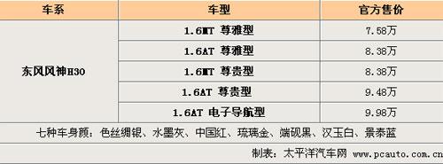1月27日,備受期待的東風(fēng)風(fēng)神首款精品兩廂車東風(fēng)風(fēng)神H30,以“從容進取、自由人生”為產(chǎn)品主張,在“自由之都”——成都拉開了全國自由上市帷幕。東風(fēng)汽車公司副總經(jīng)理、東風(fēng)乘用車公司總經(jīng)理李紹燭公布了東風(fēng)風(fēng)神H30五款上市車型的價格:1.6MT尊雅型7.58萬元,1.6MT尊貴型8.38萬元,1.6AT尊雅型8.38萬元,1.6AT尊貴型9.48萬元,1.6AT 電子導(dǎo)航型9.98萬元。