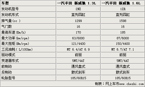 豐田新威馳將繼續(xù)搭載1.3L和1.6L兩款發(fā)動(dòng)機(jī),來滿足不同消費(fèi)者的需求。這兩款發(fā)動(dòng)機(jī)都是直列4缸16氣門引擎,具有可變節(jié)氣門技術(shù),在保證強(qiáng)勁動(dòng)力輸出的同時(shí),又可以達(dá)到了良好的節(jié)油性能,1.6L自動(dòng)擋車型的百公里油耗僅為7.1L,1.3L手動(dòng)擋車型的油耗更為節(jié)省,百公里油耗不到6.4L。在動(dòng)力輸出方面,1.3車型的最大功率和最大扭矩分別達(dá)到了6.3Kw和121Nm,同時(shí)1.6車型的最大動(dòng)力輸出也達(dá)到了87Kw和150Nm。在同級車中絕對稱得上是出類拔萃。在變速器方面,分別裝配上了5速手動(dòng)變速器和4速手自一體變速器。新威馳的制動(dòng)器均為前盤后鼓式制動(dòng)器。