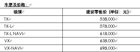 作為舊款VX級別車型的延續(xù),TX-L級別配置更加豐富,采用4.0L雙VVT-i的發(fā)動機(jī),性能大幅提升。除沿用了舊款VX級別所配備的主動牽引力控制系統(tǒng)A-TRC以及車輛穩(wěn)定控制系統(tǒng)VSC外,還增加了第三排座椅電動折疊功能、智能鑰匙及一鍵啟動系統(tǒng)、自發(fā)光式儀表盤等,同時,SRS空氣囊也增至7個。在這種配置下,TX-L級別的價格設(shè)定為57.8萬元,比舊款VX級別的價格還低7千元。