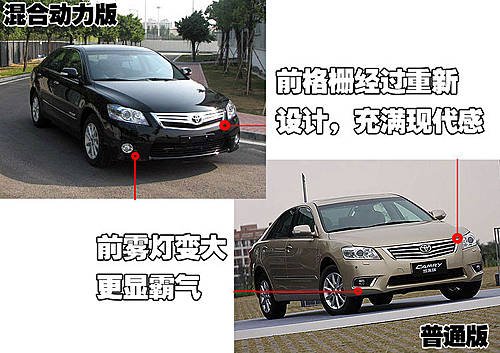 這款混合動(dòng)力版凱美瑞的整體造型與普通版凱美瑞相同,但前臉部分設(shè)計(jì)變得更加前衛(wèi),猶如飛翔的翅膀。混合動(dòng)力凱美瑞采用了圓形前霧燈,加大的設(shè)計(jì)不僅使整車顯得更為霸氣,而且更突出的前進(jìn)氣隔柵。