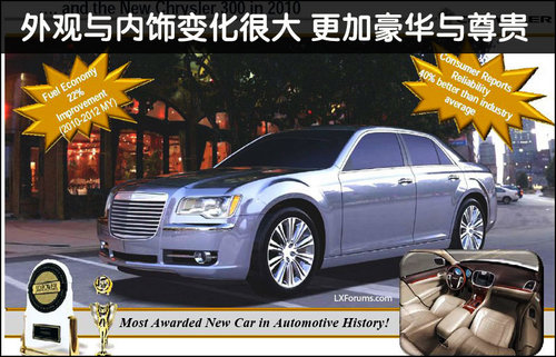 新克萊斯勒300C將會在明年迎來新的春天,新款車型在外觀與內飾都有多處改進。據得到的一些消息稱2011款300C會在燃油經濟性上改進19%,而且在娛樂裝備系統(tǒng)上也將會達到一個新的水平。馬力上方面會有克萊斯勒的Phoenix V6發(fā)動機與HEMI V8發(fā)動機兩種,高端的SRT8版本依然存在。在安全裝備方面包括有盲區(qū)監(jiān)測系統(tǒng),ESC,能源回收型的轉向柱,后側車身加固結構等。