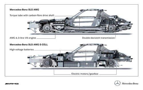 由于前軸的電動(dòng)機(jī)占用了一定的空間,SLS E-Cell的前懸將從SLS的雙叉臂變?yōu)槎噙B桿結(jié)構(gòu)。新車的鋰電池組位于車輛中部和后部,擁有480千瓦的功率。電池的冷卻則有專門的兩個(gè)循環(huán)系統(tǒng)完成。