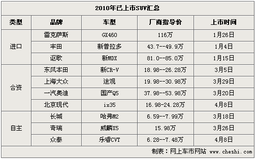 從年初至今,已經(jīng)上市的SUV車型達(dá)到了10款之多,而3月上市的就占到5款。其中上海大眾途觀在上市預(yù)售首月訂單就突破了4萬(wàn)輛的;隨后上市的國(guó)產(chǎn)奧迪Q5訂單已經(jīng)排到明年,目前購(gòu)買這兩款車仍需要加2.5萬(wàn)-3萬(wàn)元才能提到現(xiàn)車。而4月8日上市的iX35則又將在日系車市場(chǎng)掀起一股搶購(gòu)熱潮。