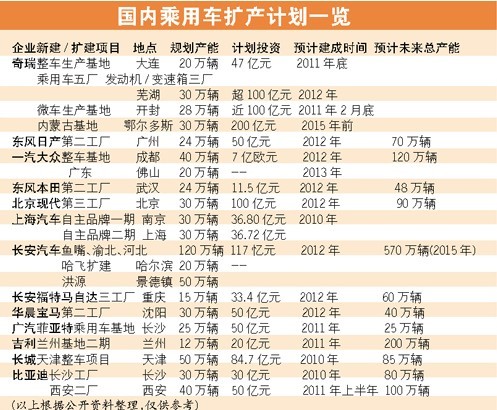 如此龐大的產(chǎn)能擴(kuò)充計(jì)劃讓相關(guān)各方憂心忡忡。今年年初,工信部向國(guó)內(nèi)車(chē)企下發(fā)了《關(guān)于調(diào)查汽車(chē)生產(chǎn)企業(yè)投資項(xiàng)目有關(guān)情況的通知》,通知要求車(chē)企上報(bào)現(xiàn)有產(chǎn)能情況和2010年~2015年產(chǎn)能規(guī)劃和投資情況。市場(chǎng)的火爆讓“產(chǎn)能過(guò)!钡膽n患呼聲逐漸熄滅,對(duì)部分廠家而言,最核心的任務(wù)仍然是增加產(chǎn)能。