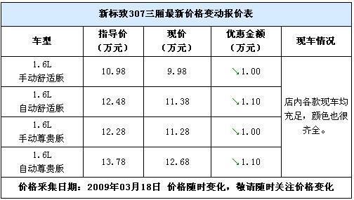 近日,筆者走訪北京雙龍雅致東風(fēng)標(biāo)致4S店時(shí)了解到,目前店內(nèi)的307三廂1.6L車型優(yōu)惠有所加大,目前手動(dòng)擋車型可以優(yōu)惠1萬(wàn)元,自動(dòng)擋車型可以優(yōu)惠1.1萬(wàn)元,店內(nèi)現(xiàn)車充足,顏色也很齊全,詳細(xì)價(jià)格信息請(qǐng)見(jiàn)下表: