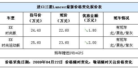 筆者近日從北京港龍基業(yè)經(jīng)銷商處獲悉,進(jìn)口三菱Lancer EX車型保持著最高2萬元的優(yōu)惠,并且近期購車還將獲贈DVD+GPS,現(xiàn)時尚型和時尚運(yùn)動型現(xiàn)車充足,紅,黑,紫灰等常見顏色均有現(xiàn)車,感興趣的朋友可以與經(jīng)銷商聯(lián)系,詳細(xì)價格信息請見下表: