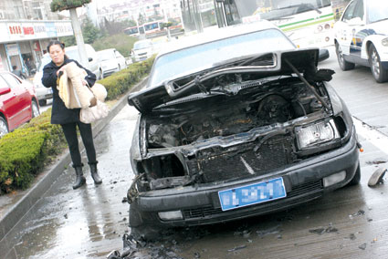 下了車后,謝先生急切地想知道發(fā)生了什么,使勁拉了拉發(fā)動機艙蓋,就是打不開。兩分鐘后,車子燃起了大火,周圍已是濃煙滾滾!坝腥四脕砹4個滅火器,對著車子直噴,不過火勢太大了,根本滅不了!敝x先生說,看著自己的車子一點點地被大火吞噬,他簡直欲哭無淚。最后消防隊趕到了現(xiàn)場,才把大火撲滅。