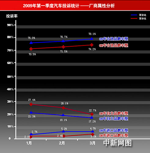 中新網(wǎng)4月24日電 日前,中國質量協(xié)會用戶委員會、車人網(wǎng)聯(lián)合發(fā)布了2009年一季度中國汽車產(chǎn)品質量與服務質量分析報告。統(tǒng)計顯示,相比去年同期,合資品牌車型的投訴增加較快,進口車投訴略有增加,自主品牌車型的投訴呈現(xiàn)遞減趨勢。