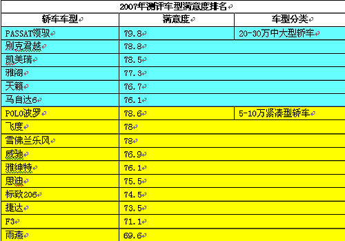 據(jù)悉,2007年全國轎車用戶滿意指數(shù)是由中國質(zhì)量協(xié)會(huì)、全國用戶委員會(huì)采用CACSI模型測(cè)評(píng)指標(biāo)體系和抽樣調(diào)查方法評(píng)定的,旨在向社會(huì)提供真實(shí)可靠的汽車產(chǎn)品質(zhì)量信息,并向汽車生產(chǎn)和銷售企業(yè)提供質(zhì)量改進(jìn)信息,具有極高的行業(yè)權(quán)威性。測(cè)評(píng)內(nèi)容由滿意度指數(shù)模型測(cè)量、新車質(zhì)量可靠性、新車設(shè)計(jì)與性能、售后服務(wù)四個(gè)方面構(gòu)成,本年度共有8大車型類別、43款車型參與測(cè)評(píng)。