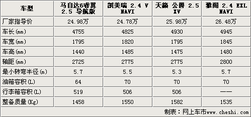 我們選取的四款車型都是位于該車系中的頂配車型,售價(jià)都在25萬元左右,馬自達(dá)6睿翼在這四款車型中屬于售價(jià)比較低的。在車身尺寸方面馬自達(dá)6睿翼是4款車型中最小的,同時(shí)在軸距方面也只有2725mm,這意味馬自達(dá)6睿翼在這四款車型中的內(nèi)部尺寸應(yīng)該是最小的。雅閣的軸距是四款車型最大的,達(dá)到了2800mm,保證了雅閣內(nèi)部空間的寬敞。凱美瑞和天籟•公爵都同時(shí)擁有2775mm的軸距,它們在內(nèi)部空間上將不會有太大的差距。四款車型中除了馬自達(dá)6睿翼外其余三款車型均達(dá)到了70升。由于馬自達(dá)6睿翼身材較小,所以在整車質(zhì)量方面它也是4款車型中最輕的。