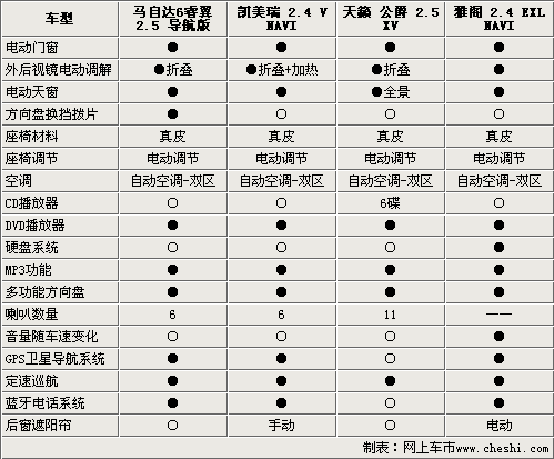 上述四款車型都屬于該車系中的頂配車型,所以在舒適配置方面可謂是應(yīng)有盡有,電動天窗、真皮座椅、自動雙區(qū)空調(diào)、多功能方向盤等設(shè)備都成為了標(biāo)準(zhǔn)配置。但仔細(xì)看下來,天籟•公爵的全景天窗比較突出,這是同級別車型中很少可以看見的。在娛樂方面,天籟•公爵的11揚(yáng)聲器系統(tǒng)比較突出,音像水平完全達(dá)到了發(fā)燒的級別。而雅閣的硬盤系統(tǒng)顯示出了它的科技感。四款車型中,只有天籟•公爵沒有配備GPS衛(wèi)星導(dǎo)航系統(tǒng)外。