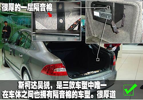打開行李箱后我們通?梢栽谝恍半[蔽”的地方發(fā)現(xiàn)一臺車的細節(jié)做工,例如這部分對比中您將看到斯柯達-昊銳在三款車型中獨有的“車輛內(nèi)側(cè)隔音棉”。