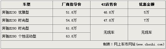 據(jù)4S店銷售人員介紹,奔馳E級(jí)現(xiàn)售的車型主要是E230和E280車型,其中E230時(shí)尚型的優(yōu)惠幅度為7萬元,達(dá)到了全系的最高,優(yōu)惠后售價(jià)從54.8萬元降到了47.8萬元。E230優(yōu)雅型優(yōu)惠5萬元,經(jīng)優(yōu)惠后售價(jià)從51.8萬元下降到了46.8萬元。銷售人員還介紹,E280全系店內(nèi)均無現(xiàn)車,所以不在此次降價(jià)范圍內(nèi)。