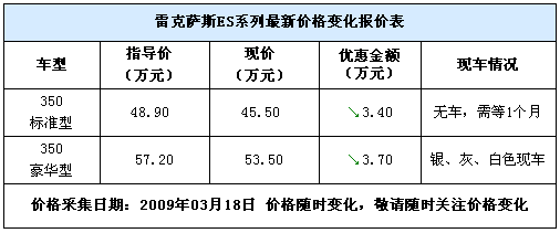 本周,編者聯(lián)系了上海和凌雷克薩斯4S店后了解到,現(xiàn)在該店雷克薩斯ES350有現(xiàn)車在售,可選車型僅為豪華型一款,現(xiàn)車有銀色,灰色和白色可選,標(biāo)準(zhǔn)款車型需提前1個(gè)月預(yù)定。價(jià)格方面,目前購買ES350最高可優(yōu)惠3.7萬元,店方還有部分禮品相贈,詳細(xì)價(jià)格信息請見下表: