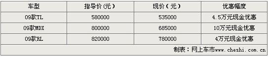 據(jù)謳歌經(jīng)銷商表示,購買謳歌全系除了可以得到最高10萬元的價格優(yōu)惠外,09款TL僅售53.5萬元。銷售人員還表示,現(xiàn)在謳歌系列車型顏色和車型齊全,可以給客人與最大的選擇空間!