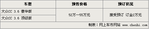 大眾CC自去年廣州車展亮相后一直受到消費者廣泛關(guān)注,此前有關(guān)這款車的詳細(xì)參數(shù)和配置已經(jīng)曝光。大眾CC將搭載3.6FSI燃油直噴引擎和6速DSG雙離合變速箱,將分豪華版和頂級版兩款。根據(jù)網(wǎng)上車市價格監(jiān)測系統(tǒng)顯示,目前這款車有望在下月到店,4S店開始接受消費者預(yù)訂,具體行情如下: