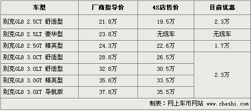 別克GL8是MPV市場(chǎng)一款非常受歡迎的車(chē)型,成為公司和商務(wù)用車(chē)的主要選擇對(duì)象,被稱為“陸上公務(wù)艙”。根據(jù)網(wǎng)上車(chē)市價(jià)格監(jiān)測(cè)系統(tǒng)顯示,目前這款車(chē)的優(yōu)惠幅度在原來(lái)2萬(wàn)元基礎(chǔ)上增加到了2.3萬(wàn)元,具體車(chē)型以及價(jià)格如下: