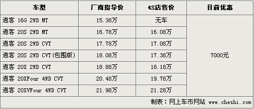 東風日產(chǎn)逍客作為一款掀背車、SUV、交用轎車的交叉車型,去年3月份上市后一直受到消費者關注,逍客不僅擁有時尚的外觀,良好的通過性,其搭載的日產(chǎn)新一代直列4缸MR20DE引擎匹配新一代CVT變速箱,使整車其具備了良好的燃油性。根據(jù)網(wǎng)上車市價格監(jiān)測系統(tǒng)顯示,目前這款車全系優(yōu)惠幅度由原來5000元增加到了7000元,具體行情如下: