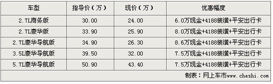 克萊斯勒300c 更讓人稱道的是其美國國家五星級安全標(biāo)準(zhǔn)配置。 大燈噴淋、倒車?yán)走_(dá)、緊急制動助力、電動防夾車窗等配置使300c 于2006年榮登《福布斯》美國市場十大最安全車型。 近日根據(jù)網(wǎng)上車市價格監(jiān)測系統(tǒng)顯示,上海地區(qū)購買克萊斯勒300C全系最高可以得到8.6萬元的現(xiàn)金優(yōu)惠。具體車型價格如下: