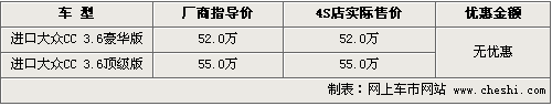 據(jù)4S店銷售人員介紹,目前進(jìn)口大眾CC現(xiàn)車已經(jīng)到店,共分兩款車型,3.6豪華版售價為52萬元,頂級版售價為55萬元。這兩款車主要差別體現(xiàn)在配置上,頂級版增加了導(dǎo)航和自動泊車系統(tǒng)等高端配置。消費者現(xiàn)在購車的話暫時還沒有優(yōu)惠幅度出現(xiàn)。現(xiàn)車方面,4S店有黑色、白色、亮銀色、藍(lán)色等可供消費者選擇。內(nèi)飾分別有黑色和黑米兩款可供挑選。