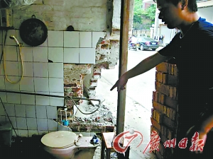 昨日上午,記者在順德區(qū)供電局附近看到,紅廟一街十五巷右邊的譚氏民居與一家水果店相接的墻角,被撞出一個能鉆進一個大人的洞口,水果店的一扇2米長的墻體完全開裂,譚氏民居內的馬桶被撞后成了碎片,門邊的一堵墻體也撞倒了,屋里到處是磚頭。此時,巷子左邊一家磨具店的老板得知店外出事后,卻怎么也打不開卷閘門,最后通過“武力”撬開門后才發(fā)現(xiàn)大門外部已被撞癟。