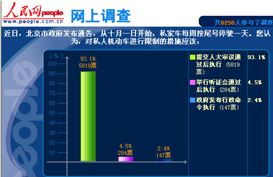 截至10月6日,共有6000余網(wǎng)友參加了我們的網(wǎng)上投票。其中,93.1%的網(wǎng)友認(rèn)為私車限行應(yīng)提交人大審議通過后執(zhí)行;4.5%人認(rèn)為這項(xiàng)決策應(yīng)舉行聽證會(huì)通過后執(zhí)行;僅有2.4%的網(wǎng)友認(rèn)為限行可以由政府發(fā)布行政命令執(zhí)行。