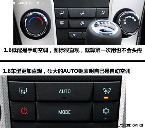 區(qū)分1.6和1.8的中控看起來比較困難,實(shí)際主要觀察空調(diào)部分的區(qū)別就能明了,科魯茲不管是手動還是自動空調(diào)都挺簡潔,上手不需要什么琢磨的時間,不過上部的音響控制區(qū)就有些晦澀了,很多按鈕如果不嘗試看字面永遠(yuǎn)也不知道什么功能,例如TP、AS、FAV等。