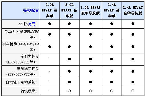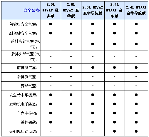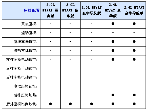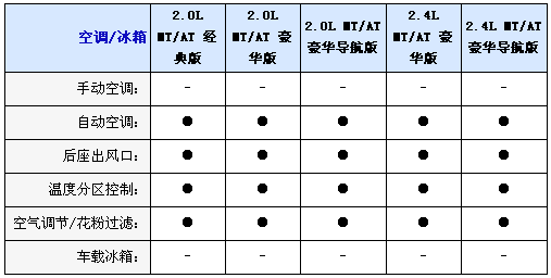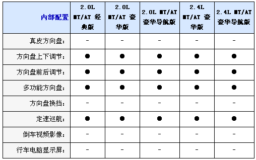 內(nèi)飾方面2.0L均配備織物座椅,而2.4L車型則采用真皮坐椅并且配備電加熱座椅,并且2.0L配備6向手動(dòng)調(diào)節(jié)駕駛座椅,而2.4L配備8向電動(dòng)調(diào)節(jié)并且代腰部支撐的駕駛座椅,不過副駕駛?cè)囅抵粯?biāo)配4向手動(dòng)調(diào)節(jié)座椅,另外入門級車型只配備CD播放器,2.0L和2.4L豪華型采用6CD播放器,而2.0L和2.4L豪華導(dǎo)航型配備DVD播放器和6.5寸寬屏液晶顯示器;包括導(dǎo)航功能,全系標(biāo)配6喇叭揚(yáng)聲器、多功能方向盤自動(dòng)分區(qū)空調(diào)和后排足部出風(fēng)口。