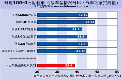 剛才我們說過,如果沒有新的寬胎加盟,速騰冠軍版將沒有資格被列入本文推薦車型,因為之前我們測過的1.8T速騰的剎車成績遠(yuǎn)達(dá)44.48米,這雖然在合格范圍內(nèi),但對于一款強(qiáng)調(diào)性能的車型來說很難讓人滿意。而現(xiàn)在的速騰冠軍版在剎車系統(tǒng)不變的情況下,剎車距離大幅減小到39.4米,這個成績已經(jīng)和奔馳S500相差無幾了。不過冠軍版懸掛和普通版本并沒有區(qū)別,所以在全力剎車是點頭現(xiàn)象還是無可避免的。