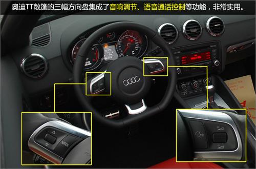 三輪輻運(yùn)動(dòng)方向盤包裹Nappa皮革,手感極佳。下部形狀扁平的設(shè)計(jì)與頂級(jí)超跑R8如出一轍。其實(shí)這種設(shè)計(jì)除了體現(xiàn)運(yùn)動(dòng)感外還有方便駕駛員進(jìn)出的實(shí)用功能。方向盤上還集成了音響控制、語(yǔ)音通話控制等多項(xiàng)功能,非常方便。